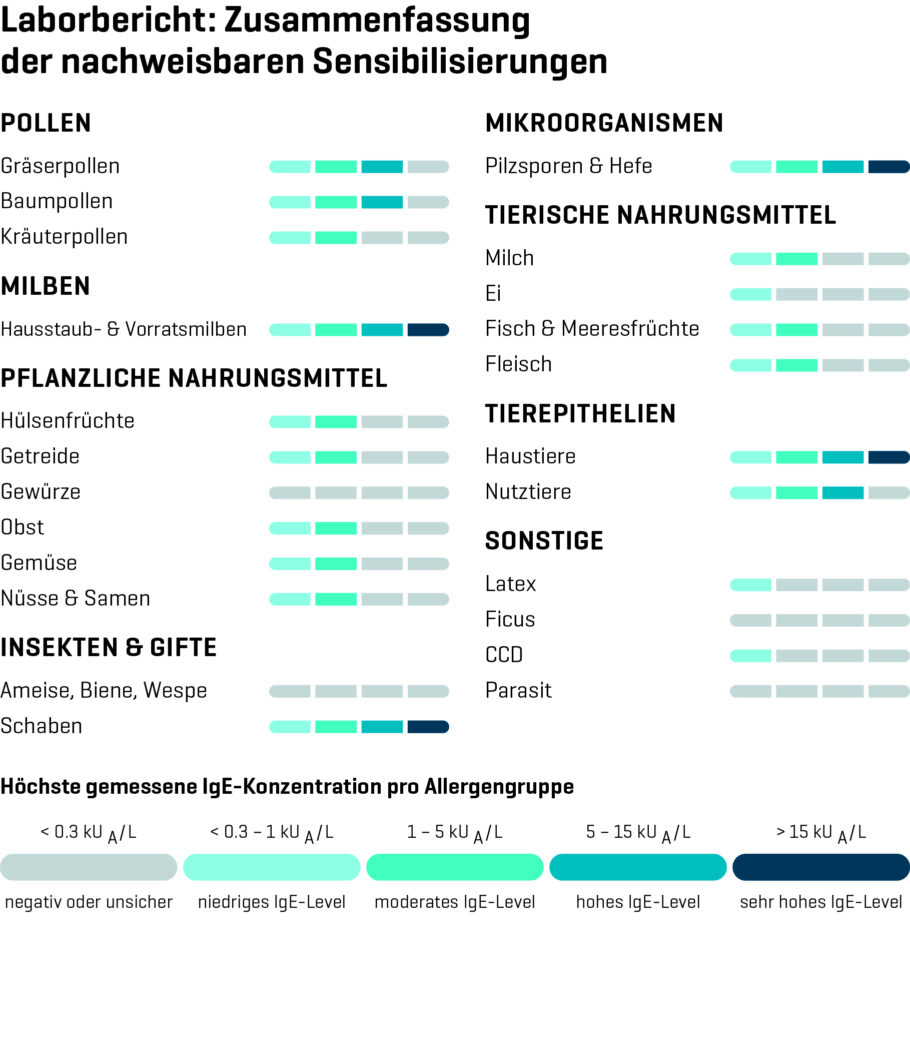 Die Krankheitsgeschichte (Anamnese) und eine Untersuchung der Patientin/des Patienten sind die ersten Schritte einer Allergiediagnose. Für das Allergen-Screening wird in der Arztpraxis dann eine Blutprobe entnommen und zur Analyse in das Labor geschickt. Das Laborergebnis wird einem verständlichen Laborbericht mit diagnostischer Beurteilung übermittelt.